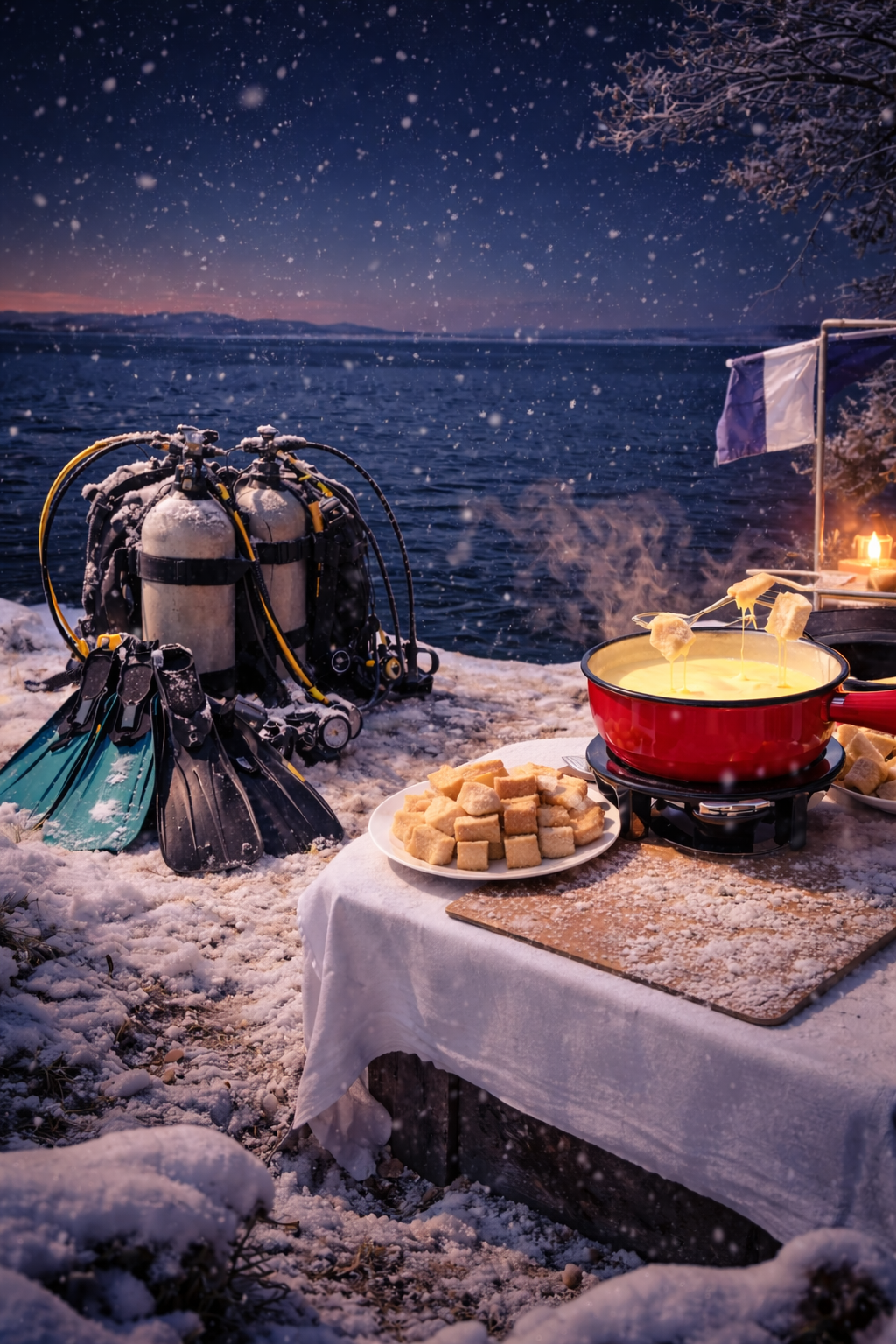 Der Schnee tänzelt in der Abenddämmerung über das Wasser. In deinem Trockentauchanzug watest du ins Wasser und geniest die Schwerelosigkeit. Lass dich von winterlichen unglaublichen Sichtweiten verzaubern und wärme dich nach dem Tauchen beim Gaumenschmaus am warmen Feuer auf.